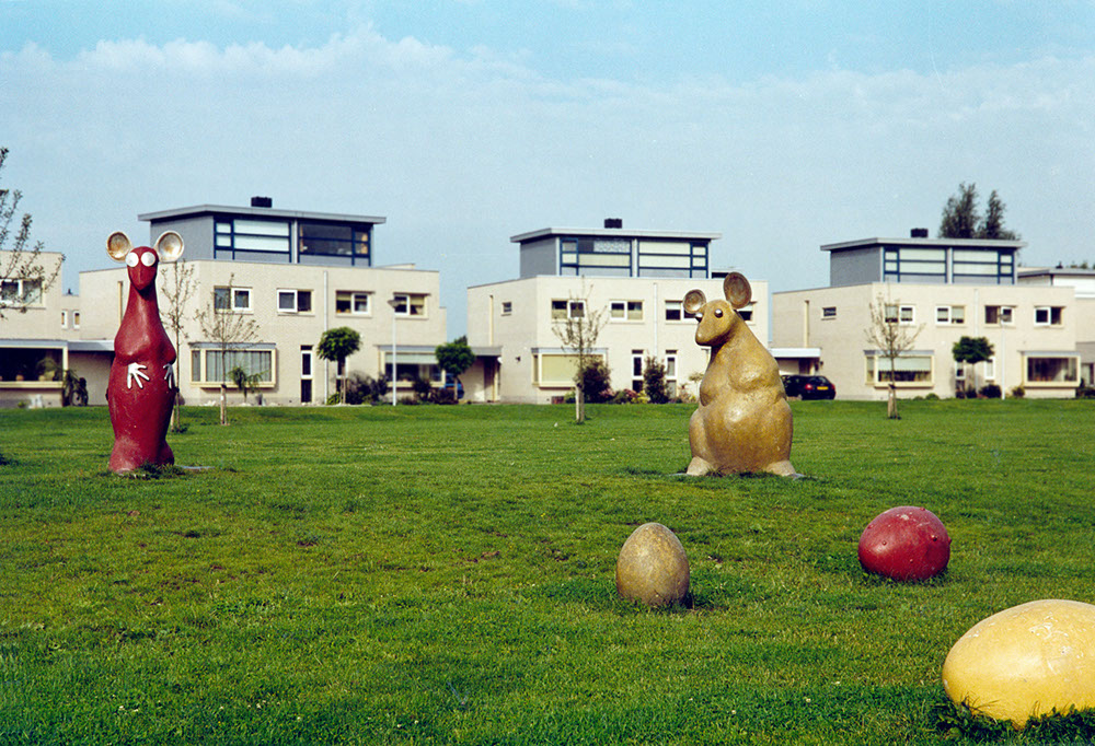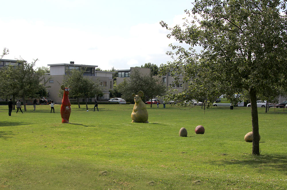 Opdracht: Een beeld te maken dat kinderen aanspreekt en past tussen de (op den duur) hoge fruitbomen en uitgesproken architectuur.