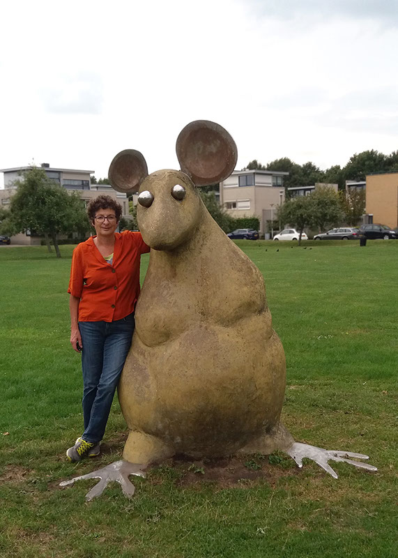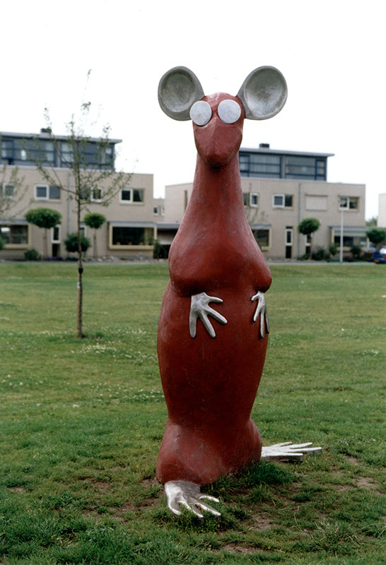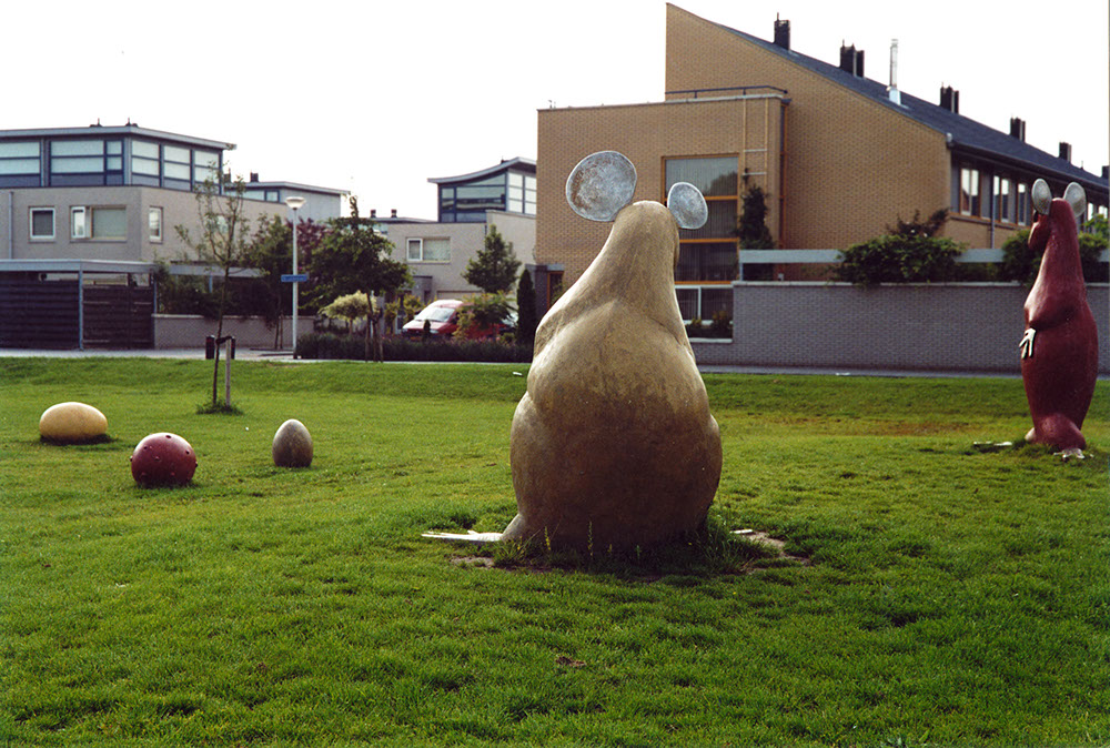 Opdracht: Een beeld te maken dat kinderen aanspreekt en past tussen de (op den duur) hoge fruitbomen en architectuur.