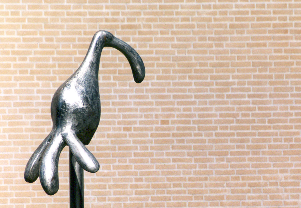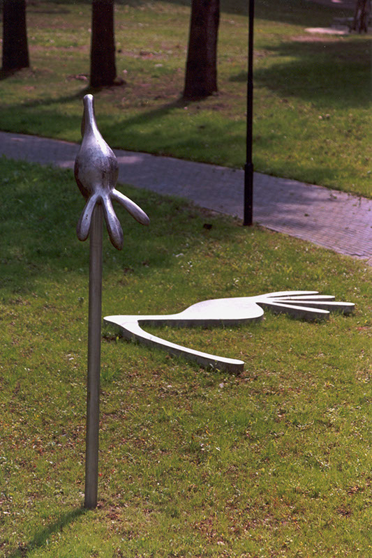 Vier terrazzo platen van gemiddeld 250 x 150 cm als landschappelijk tekening en twee sculpturale vogels op een paal, gegoten RVS en gecoat gietijzer.