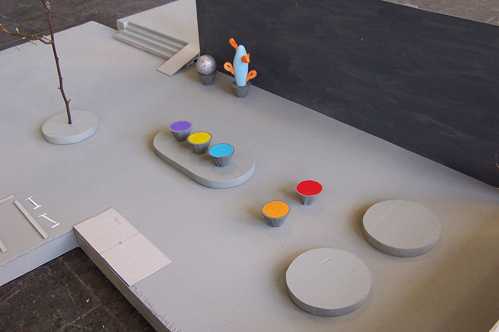 In het ontwerp zijn de bestaande plantenbakken hergebruikt als tafel, zitelement en sokkel voor polyester cactussen. Echte planten in bakken blijken uit ervaring niet te overleven. Polyester cactussen hebben een sculpturale impact, zijn vrolijk van kleur en hoeven niet verzorgd te worden. De bestaande banken er tafels worden verwijderd. Omdat het mij opviel dat de kinderen vaak op de tafels stonden en deze als een soort podium gebruikten, heb ik in het ontwerp niveauverschillen aangebracht in de bestrating als een soort plateaus waar zij op kunnen zitten en staan. De bestrating is hergebruikt. De containers in camouflagekleuren van de bestrating geschilderd. Plaatsing van een boom, met aan de voet een verhoogd boomrooster, dat als zitelement dient.
