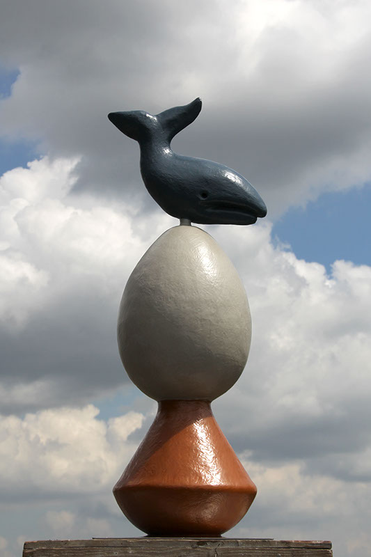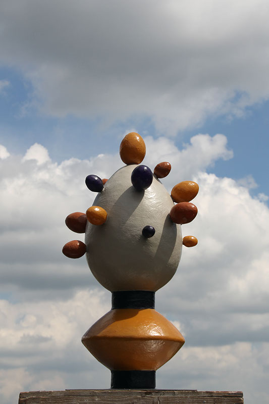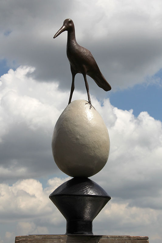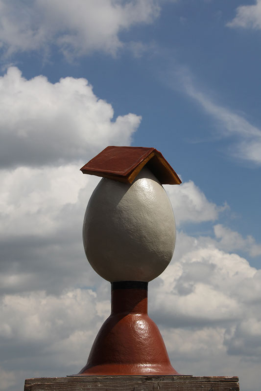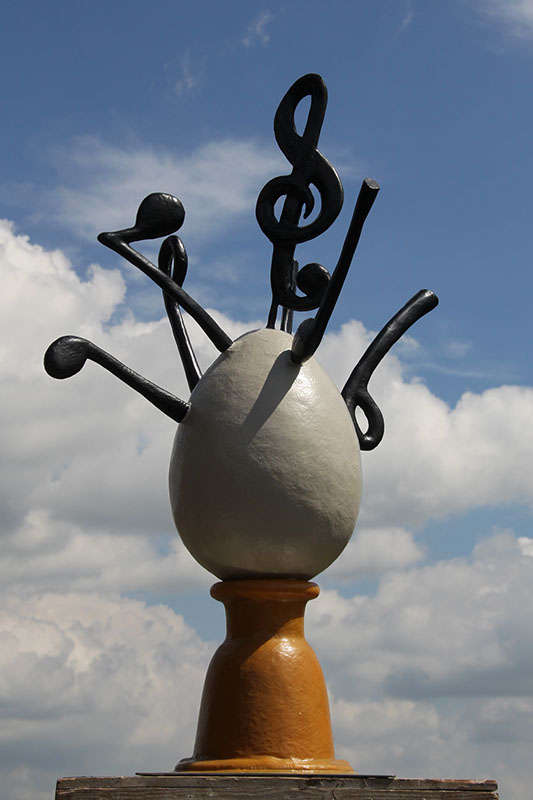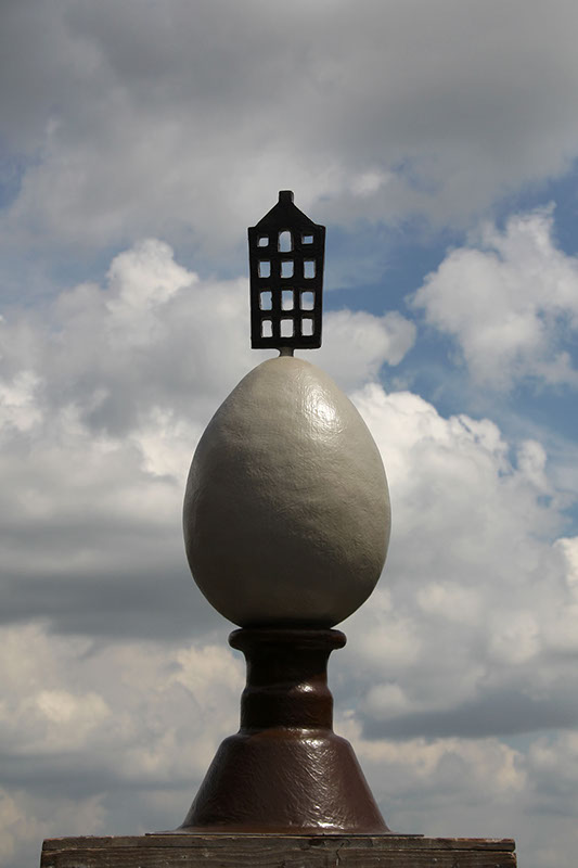 Om op een eenvormige manier aan te sluiten bij de architectuur van het gebouw heb ik gekozen voor twaalf eieren van de zelfde maat, maar in diverse verschijningsvormen. Geïnspireerd op kernwoorden die de mensen van het Cultuurhuis hebben aangegeven. De pinakels zijn tussen de 80 en 110 cm hoog.