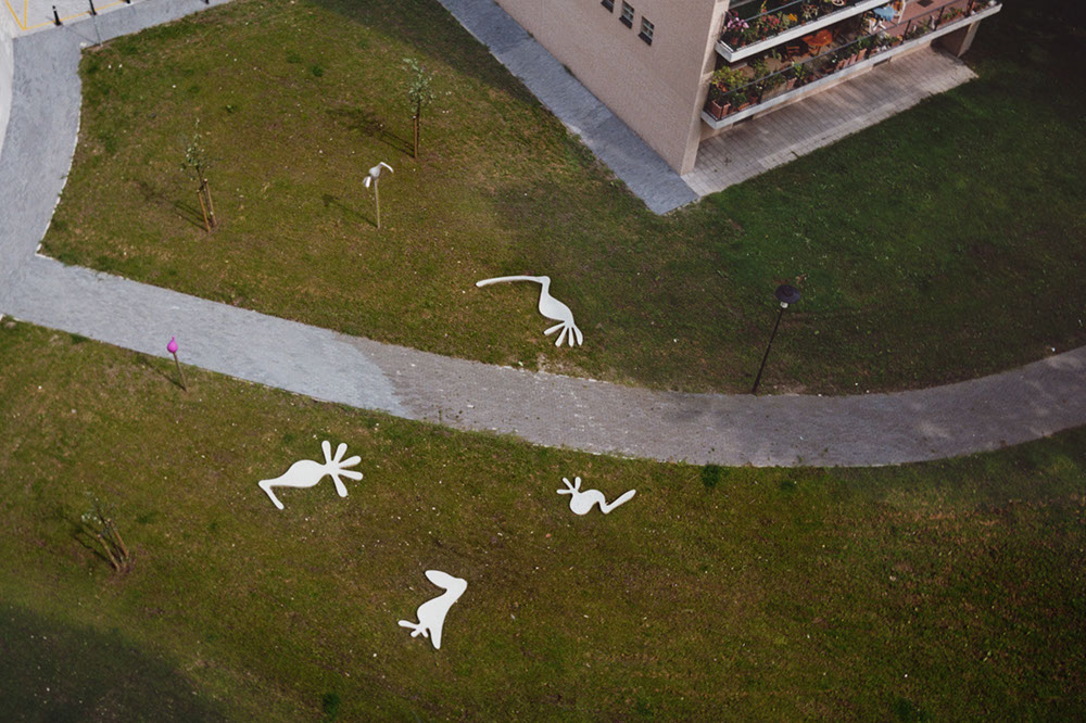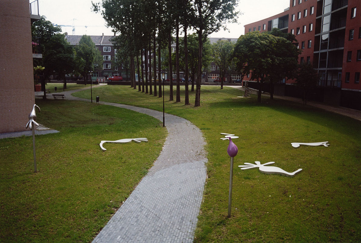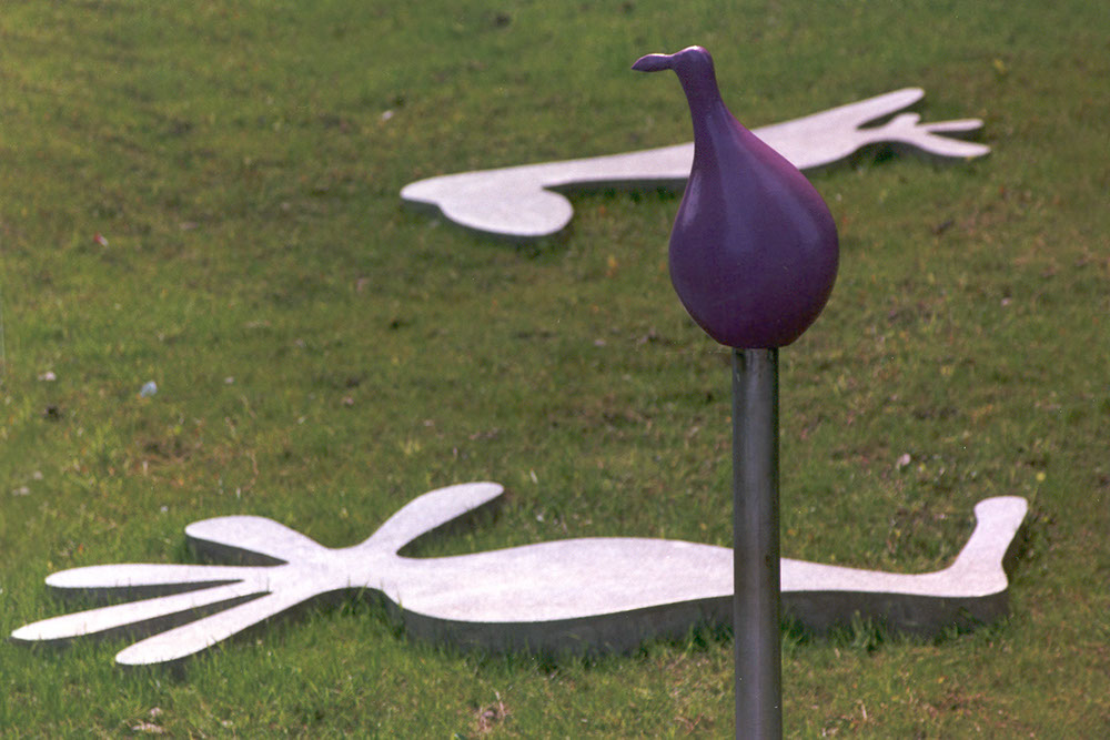 Vier terrazzo platen van gemiddeld 250 x 150 cm als landschappelijk tekening en twee sculpturale vogels op een paal, gegoten RVS en gecoat gietijzer.