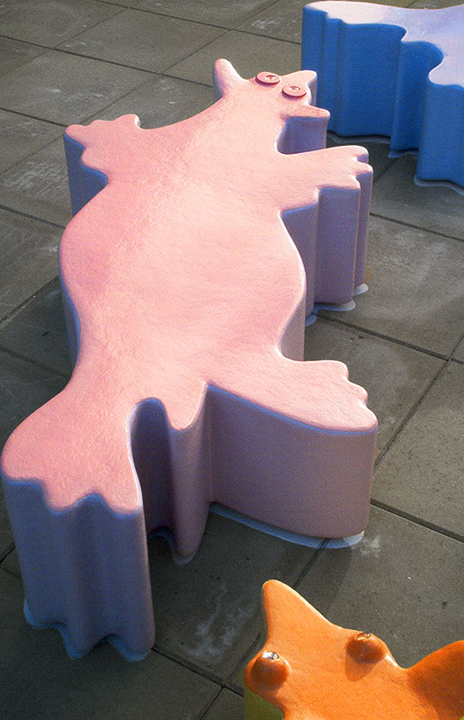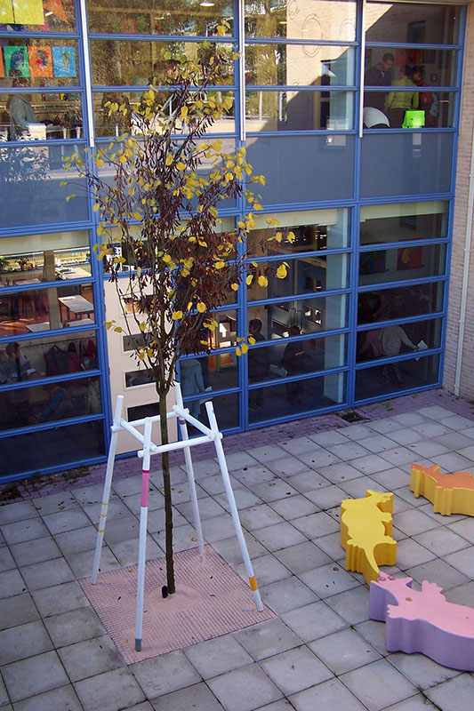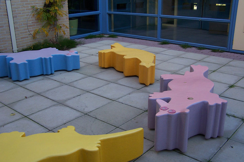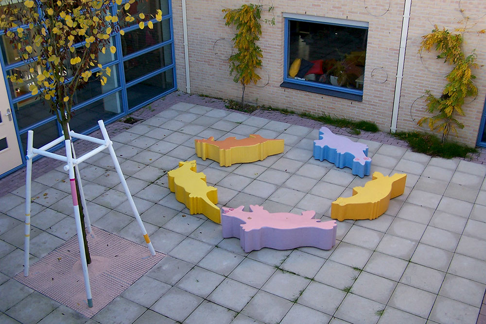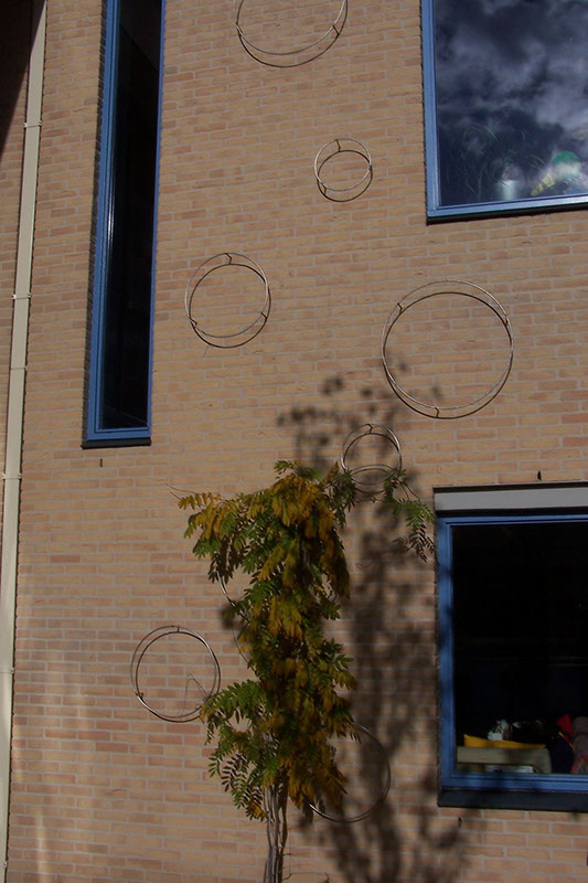 Vijf verplaatsbare polyester zitelementen in de vorm van dieren. Zesentwintig RVS ringen op de zuid gevel als klimrek voor twee klimplanten, Witte Regens. En een boom, een Cersis Siliquastrum.