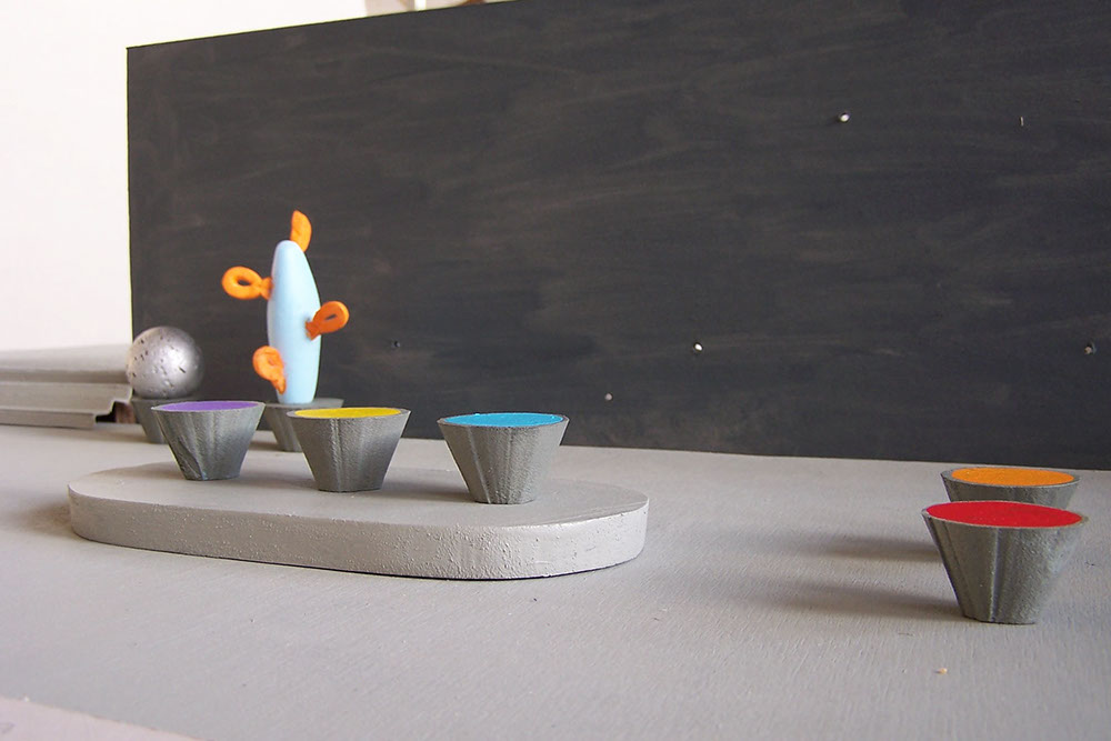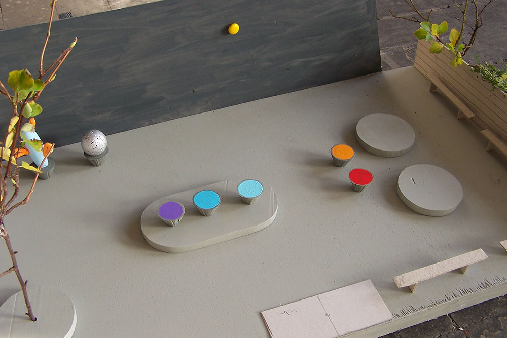 In het ontwerp zijn de bestaande plantenbakken hergebruikt als tafel, zitelement en sokkel voor polyester cactussen. Echte planten in bakken blijken uit ervaring niet te overleven. Polyester cactussen hebben een sculpturale impact, zijn vrolijk van kleur en hoeven niet verzorgd te worden. De bestaande banken er tafels worden verwijderd. Omdat het mij opviel dat de kinderen vaak op de tafels stonden en deze als een soort podium gebruikten, heb ik in het ontwerp niveauverschillen aangebracht in de bestrating als een soort plateaus waar zij op kunnen zitten en staan. De bestrating is hergebruikt. De containers in camouflagekleuren van de bestrating geschilderd. Plaatsing van een boom, met aan de voet een verhoogd boomrooster, dat als zitelement dient.