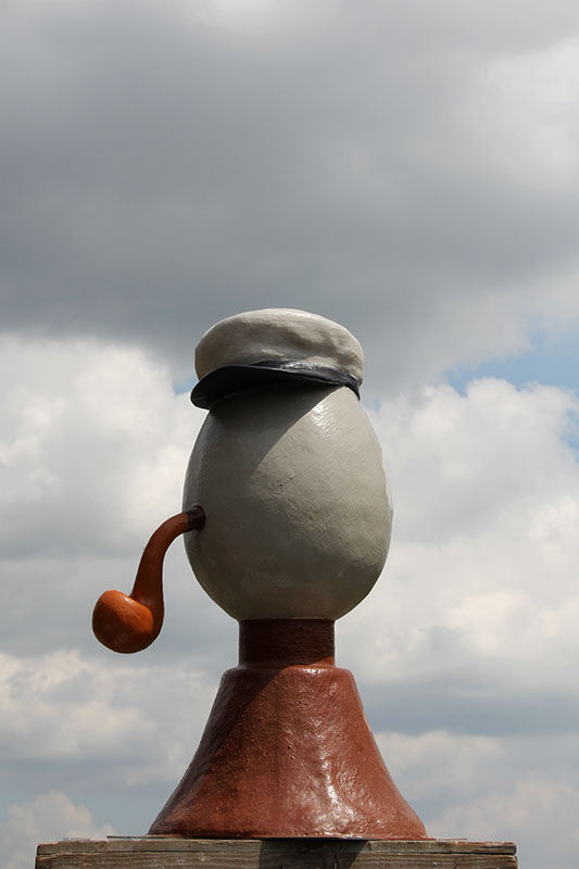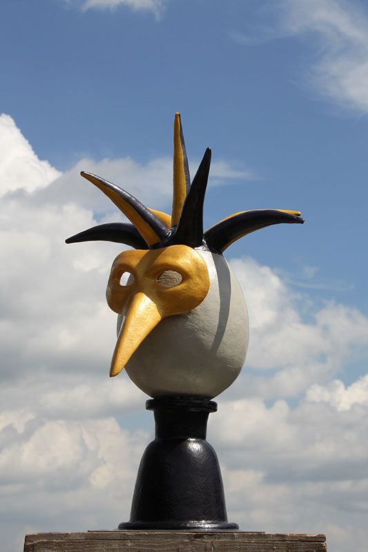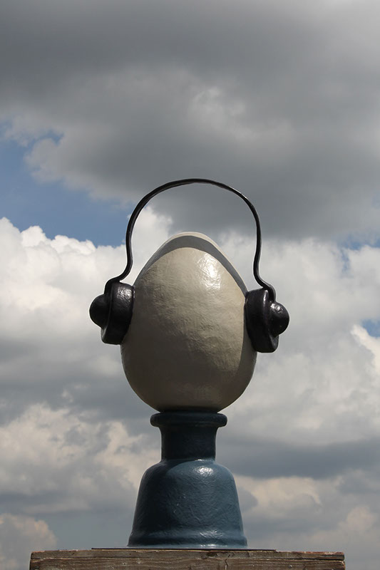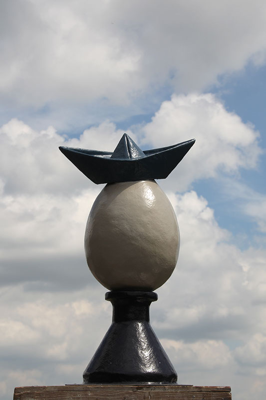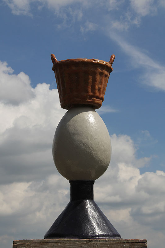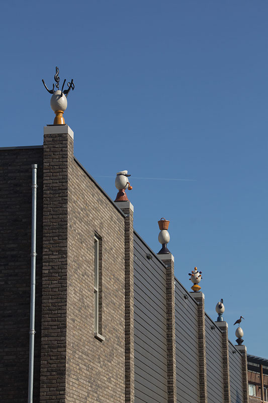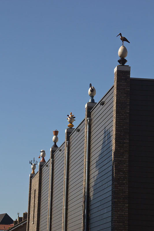 Om op een eenvormige manier aan te sluiten bij de architectuur van het gebouw heb ik gekozen voor twaalf eieren van de zelfde maat, maar in diverse verschijningsvormen. Geïnspireerd op kernwoorden die de mensen van het Cultuurhuis hebben aangegeven. De pinakels zijn tussen de 80 en 110 cm hoog.