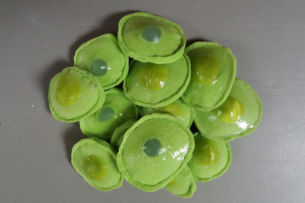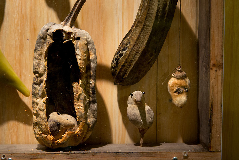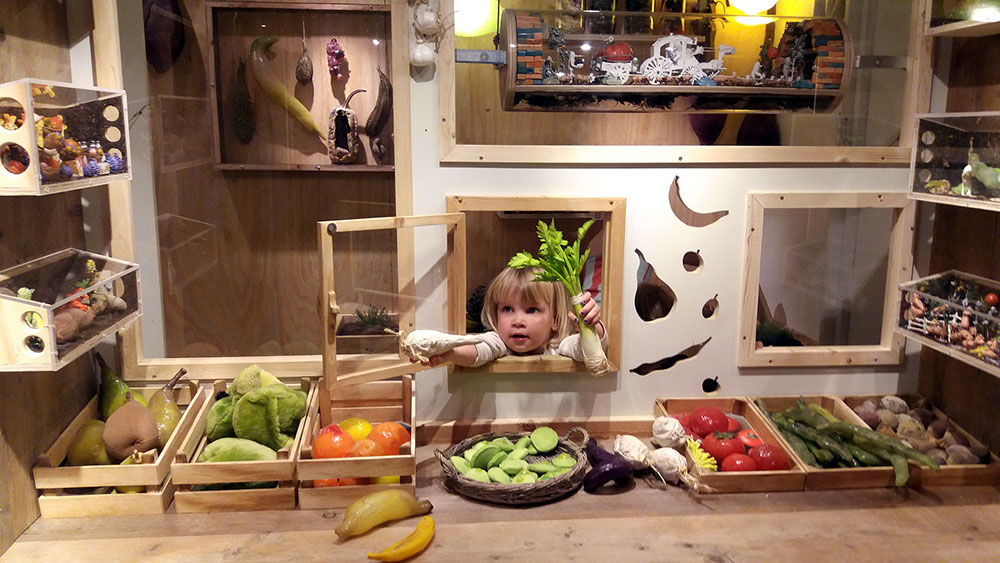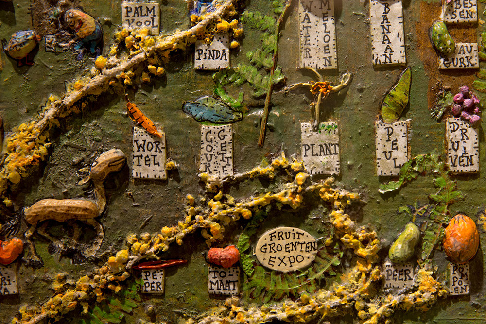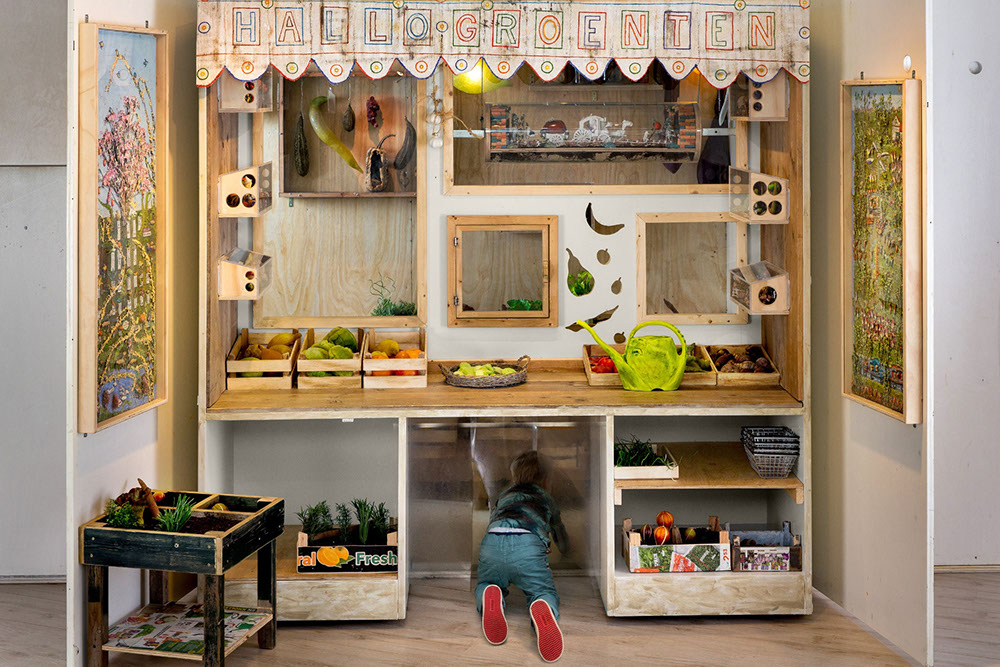 De schilderij-panelen in de deuren en de kijkdozen met pindavolk zijn gemaakt door Agnes en vertellen het verhaal van de groentenkraam. De diverse wonderlijke groenten en attributen daaromtrent zijn van mij. De totaal opzet is van ons samen.