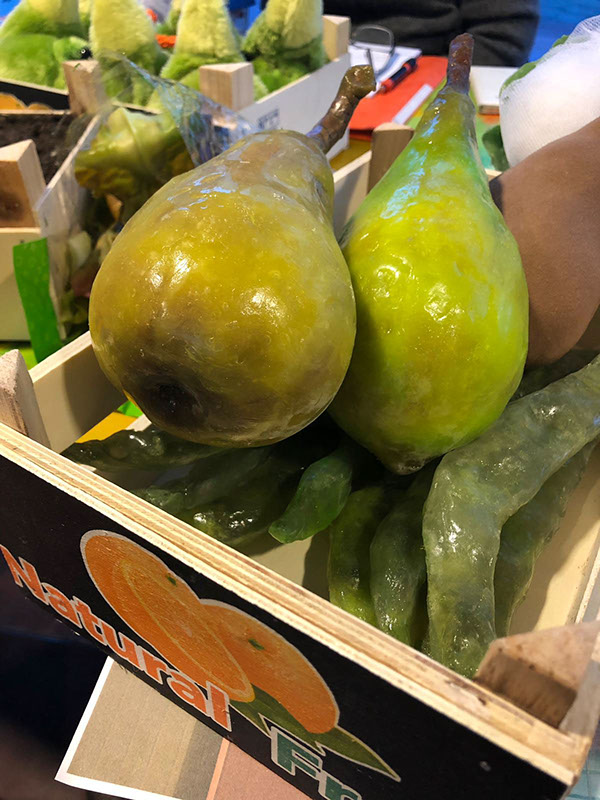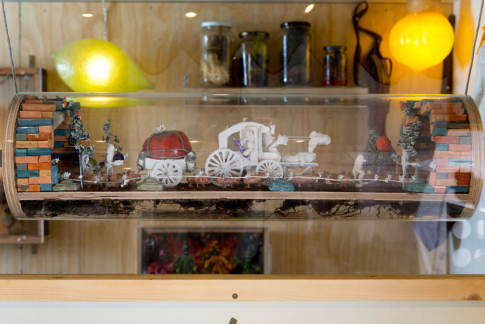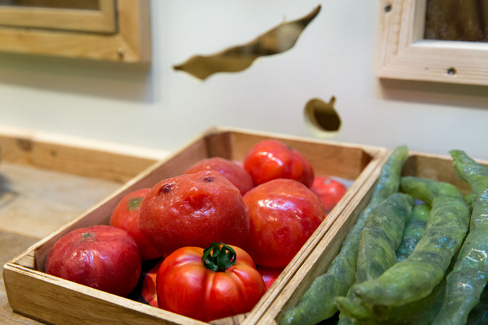 De schilderij-panelen in de deuren en de kijkdozen met pindavolk zijn gemaakt door Agnes en vertellen het verhaal van de groentenkraam. De diverse wonderlijke groenten en attributen daaromtrent zijn van Jeannette.
